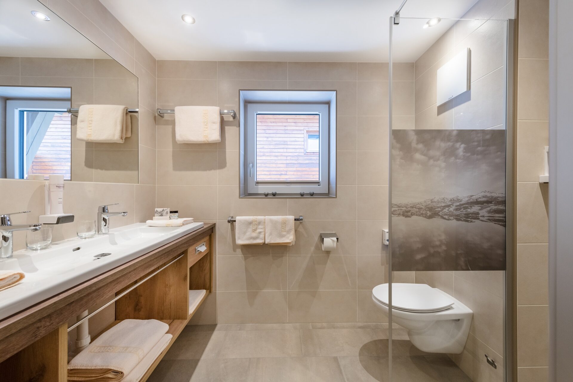 - 1 Badezimmer mit Dusche & WC, Handseife, Duschgel, Haartrockner, Kosmetikspiegel und Cleenextücher