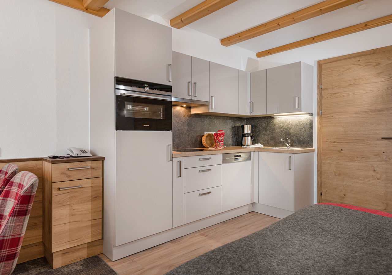 - 1 Schlaf-Wohn & Essbereich mit Doppelbett, Küche mit 4-Platte E-Herd, Backrohr, Kühlschrank mit kleinem Gefrierfach, Geschirrspüler mit Geschirrspülmittel, Filterkaffeemaschine, Koch- und Essgeschirr sowie Gläser